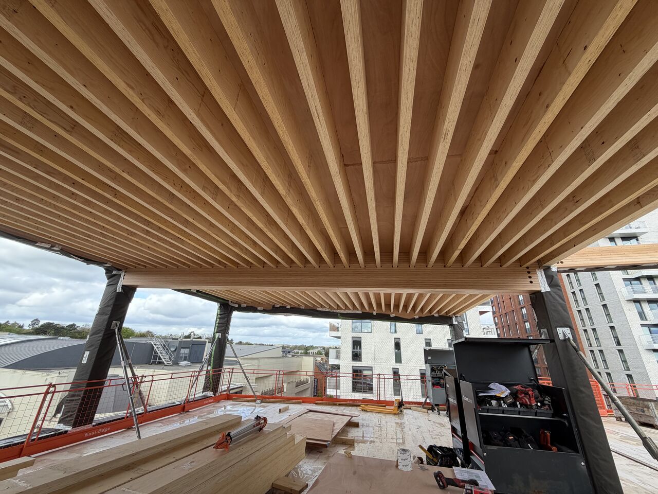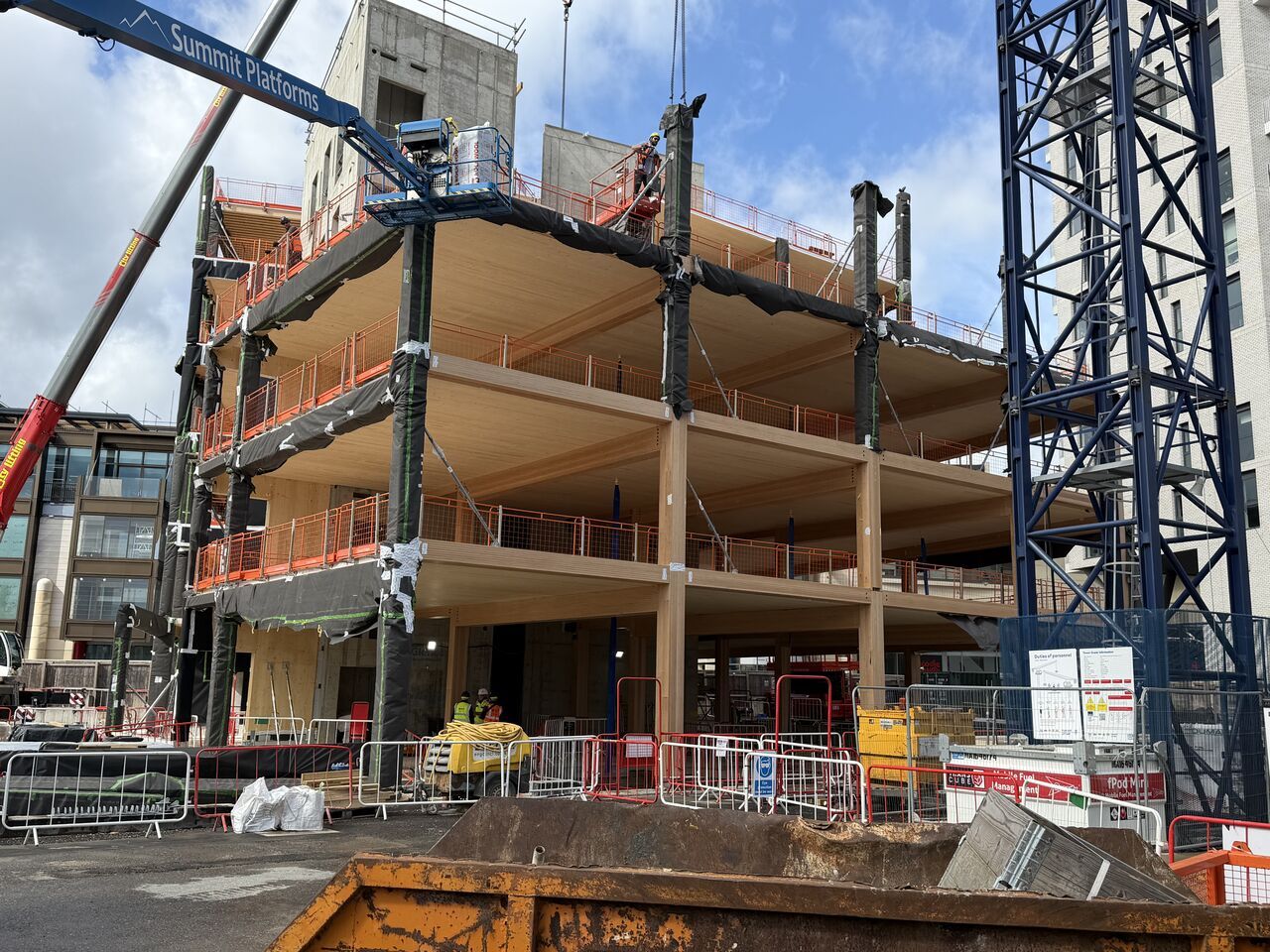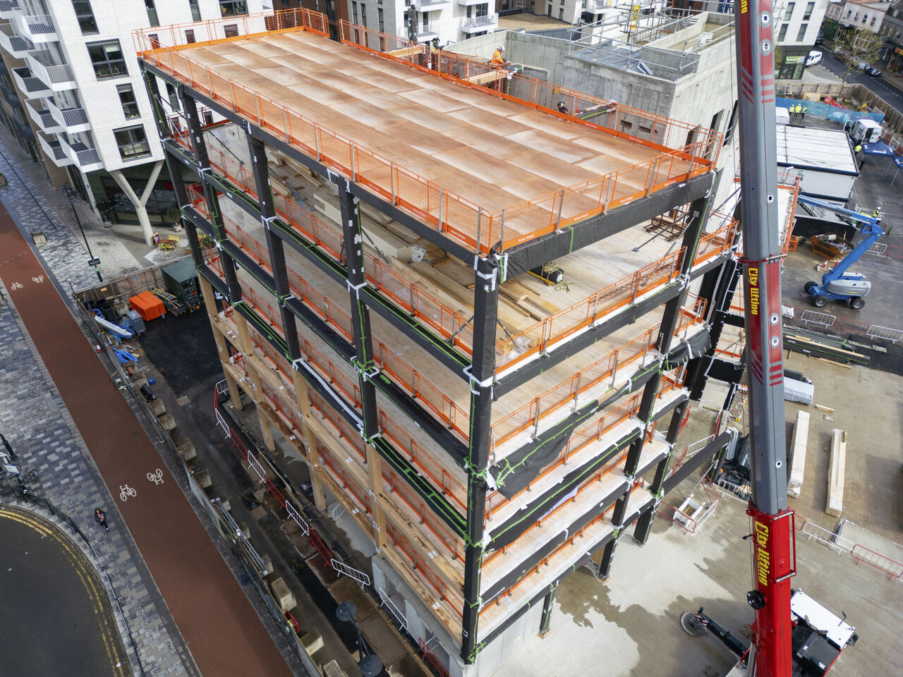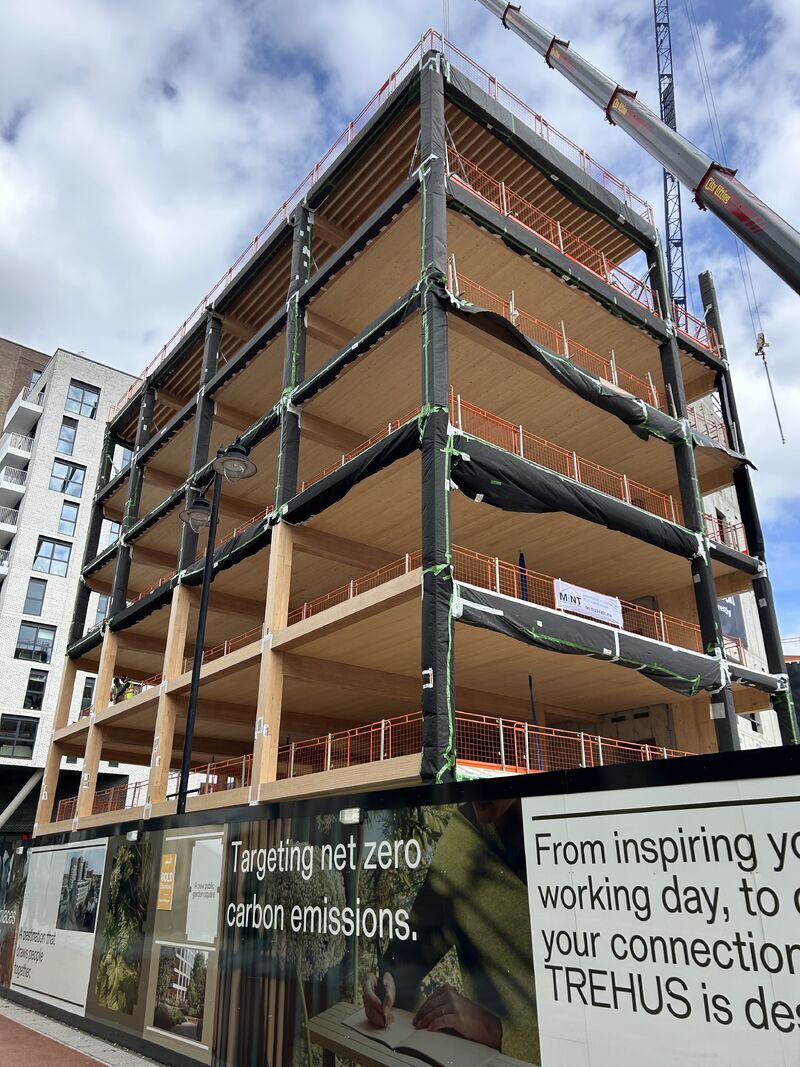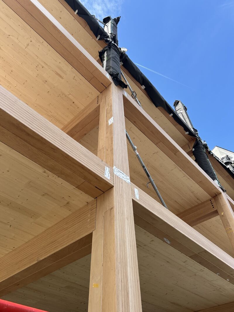 Im englischen Maidenhead - 20 km westlich von London-Heathrow - wurde vor gut einer Woche mit der Signierung des letzten Holzträgers der Abschluss der Montage des Holztragwerks eines sechsgeschossigen Gewerbebaus gefeiert. Der britische Developer HUB (hubLiving) und die norwegische Fondsgesellschaft Smedvig Capital investieren in zentraler Lage am Bahnhof der Stadt (60.000 Einwohner) in ein Vorzeigeprojekt mit rund 6.000 m² Büro- und Einzelhandelsflächen mit hohem Anspruch an die Gebäudenachhaltigkeit (ESG-Kriterien) und vergleichsweise kleinem CO2-Fußabdruck.