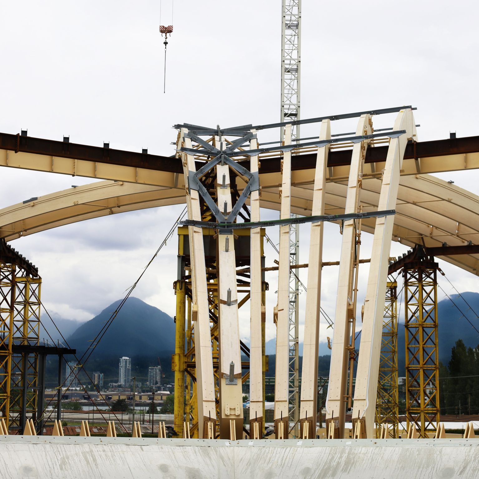 60 bogenförmige Leimbinder aus der Produktion von Nordic Structures bilden, zu sechs kalottenförmigen Segmenten angeordnet, das in der Mitte 24 m hohe Dach der „Freedom Mobile Arch“, wie das PNE-Amphitheatre künftig heißen soll. Es bleibt an drei Seiten offen und ermöglicht dem Publikum auch künftig Blicke über die Stadt und auf das Fjord- und Bergpanorama der North Shore Mountains, um vom Charme der alten Arena einen Teil in die Zukunft mitzunehmen.
