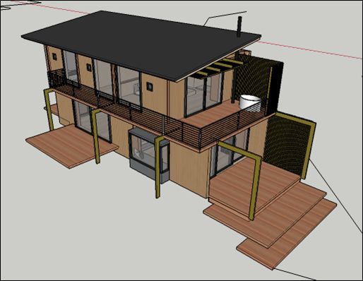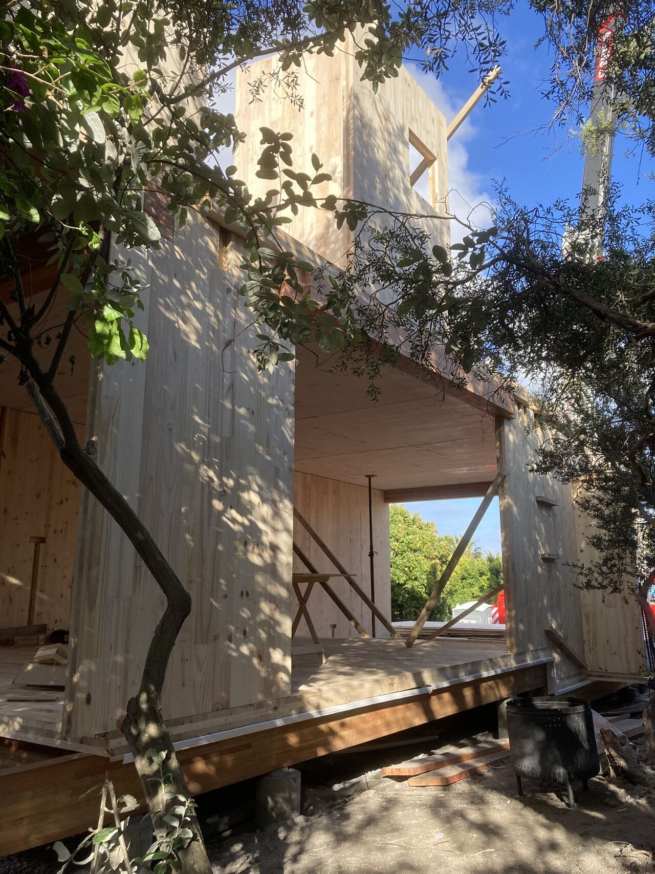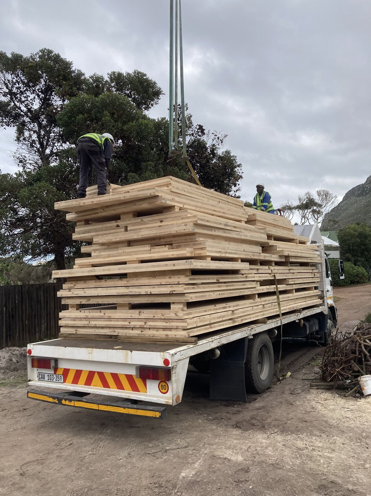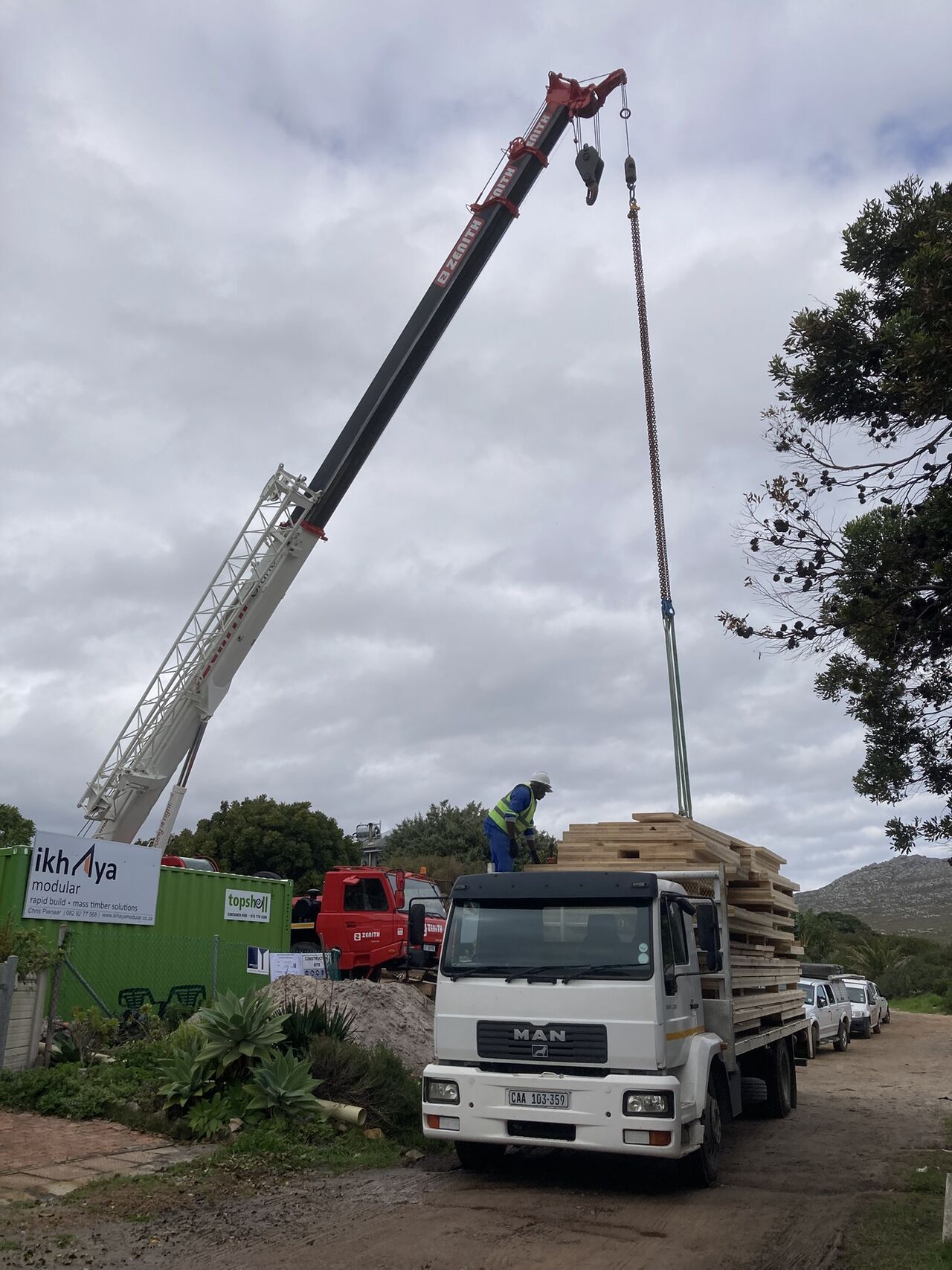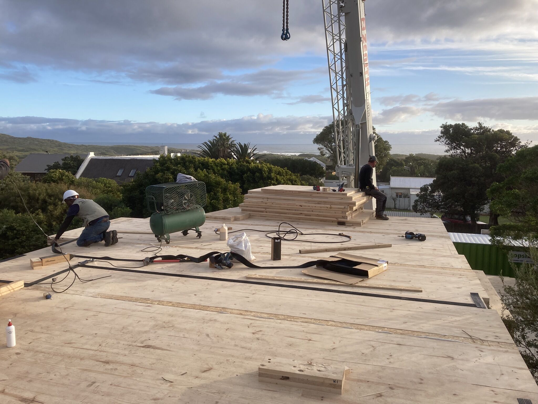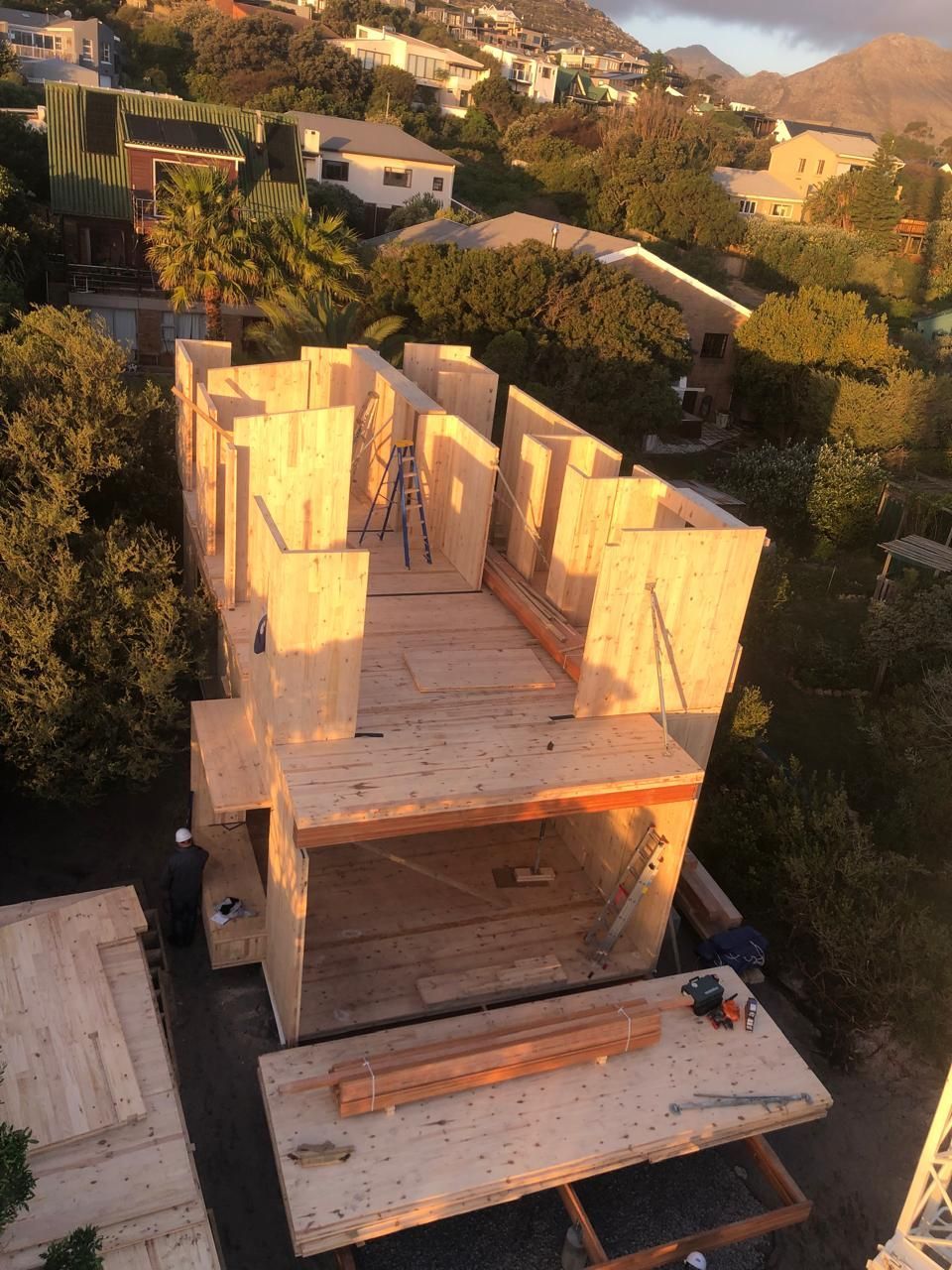 Der von Mano Kalos Architekten individuell entworfene Zweigeschosser mit Pultdach und Blecheindeckung wird von der Baufirma Ikhaya Modular aus werksvorgefertigten Komponenten errichtet. Dieser Modulbauer hat sich auf die Planung und Lieferung schnell zu errichtender Massivholzgebäude spezialisiert.