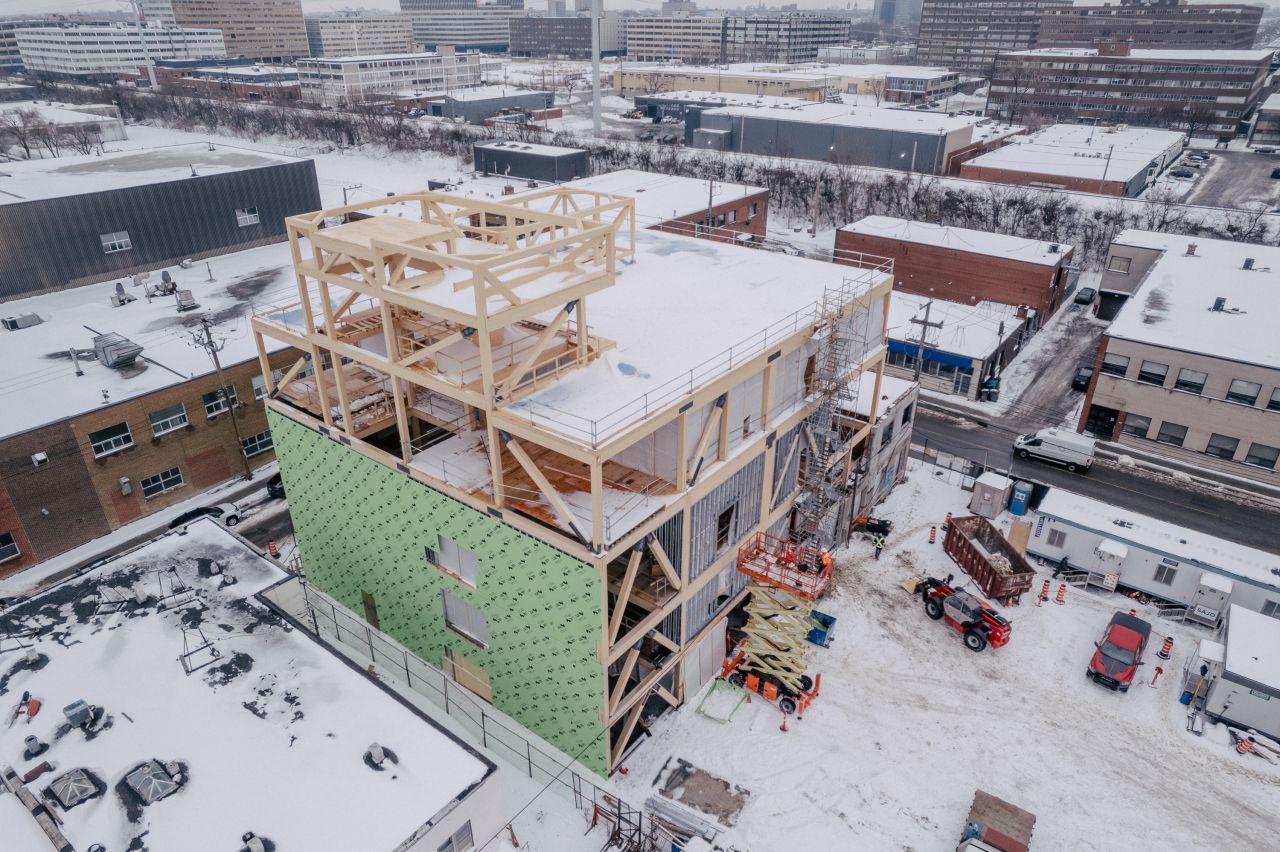 Möglich wurde das Projekt durch die Investition der Bundesregierung in Höhe von 10,2 Mio. CAD und eine weitere der Provinz Québec von rund 1 Mio. CAD. Die Bauarbeiten sind 2025 unter der Regie von der SAJO Inc. als GU angelaufen, unterstützt von NHB Construction Inc. bei der Montage. Die Tragwerksplanung lieferte Latéral, die Holzbaukomponenten kommen von Ambiance Bois Structures mit Brettschichtholz aus der Produktion von Nordic Structures.