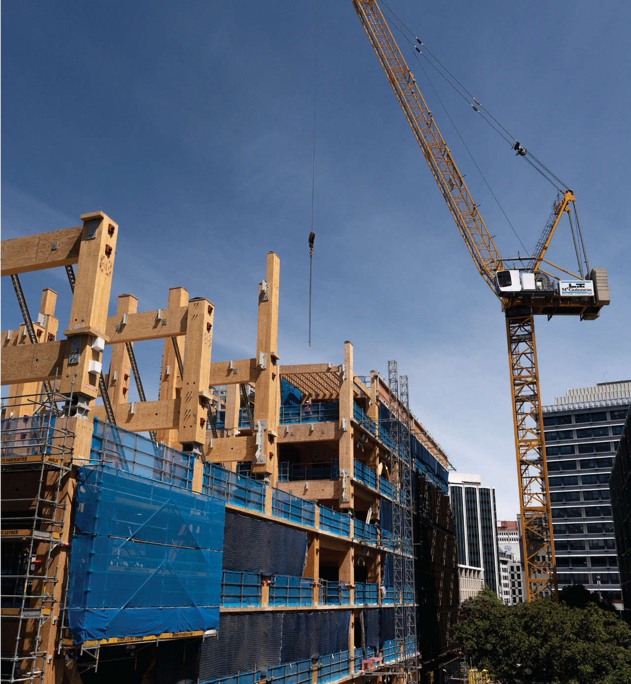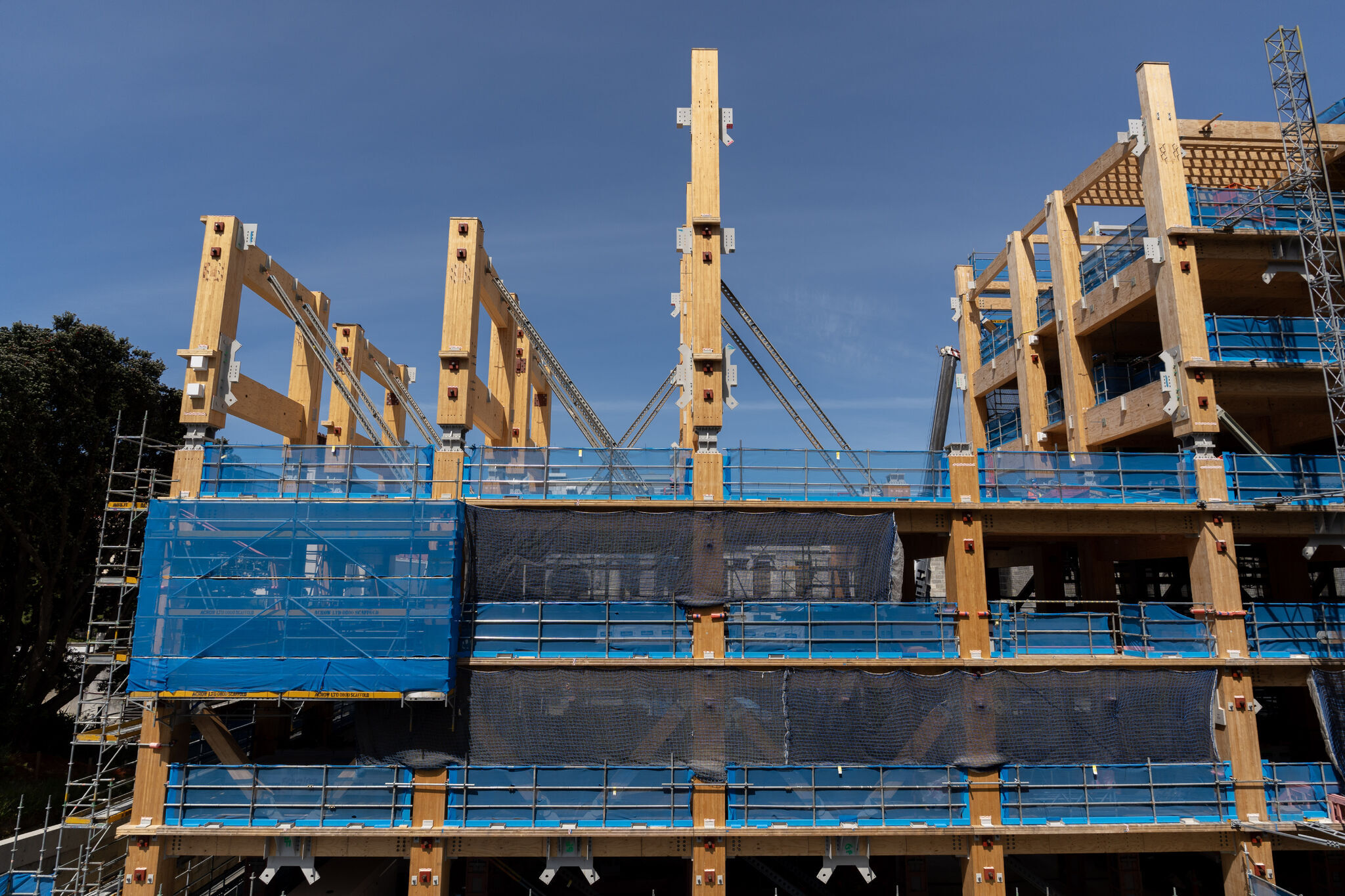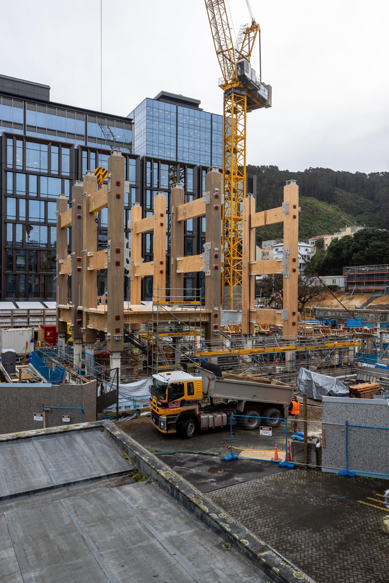 Jeder der H-Rahmen besteht aus 80 cm dicken BSH-Stützen, die durch drei massive Stege verbunden sind und 18,5 t wiegt. Gebaut wurde mit Brettschichtholz (BSH) und Brettsperrholz von Red Stag TimberLab in Auckland sowie Furnierschichtholz (LVL) von Nelson Pine Industries Ltd. in Nelson. Die Bauarbeiten führten u.a. die Firmen LT McGuinness Ltd. McGuiness (Holzbau) und Aurecon (u.a. Gebäudetechnik und Fassade) durch. RCP ist mit der Projektleitung beauftragt. Die Geschossdecken wurden als mehrschichtiges System mit Doppelböden konzipiert, in denen Kabel und Rohrleitungen geführt werden.