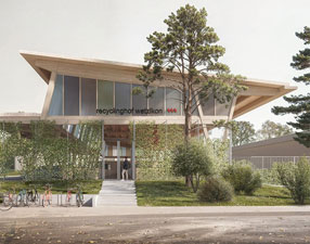 In einem Atelierwohnhaus entlang der Strasse stapeln sich Gewerberäume und doppelgeschossige Wohnateliers mit privaten, lärmgeschützten Patios. Das zweite Haus steht senkrecht zur Strasse. Es folgt mit seiner gestaffelten Form einem Bachlauf und ist mittels Abtreppungen in die ansteigende Topografie eingefügt.